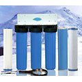 Big heavy-duty 20"x5" Whole House Water Filter for high flow applications. This big blue filter with three cartridges will remove hundreds of contaminants from water, while providing an adequate water flow. This filter has three 20"x5" water filter cartridges that are designed for high-flow water filtration applications. Unique, wide cartridges are capable of filtering enough water for a large house, apartment or busy office. Triple High-Flow Whole House Filter features: * First Filter Cartridge is a 20" sediment filter cartridge that removes sediment, silt, sand and dirt. This cartridge also extends life of other, more expensive cartridges and prevents damage * Second Filter Cartridge is a multi-stage filter that consists of one micron filter pad, KDF55, KDF85, Ceramic Balls, Granular Activated Carbon (GAC), and another 1-micron pad. This filter will remove hundreds of contaminants from water * Third Cartridge is a 20"x5" solid carbon cartridge for removing volatile organic compounds (VOCs), insecticides, pesticides and industrial solvents Whole House Filter Technical Specifications * Compact design, easy filter cartridge changes * Pressure release Valve * Wall Bracket * Available in 3/4", 1" or 1 3/4" NOT NPT input/output (please specify when ordering) * Filter Life: 160,000 gallons - Pressure Release Valve