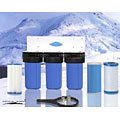 Big heavy-duty 10"x5" Whole House Water Filter for high flow applications. This big blue filter with three cartridges will remove hundreds of contaminants from water, while providing an adequate water flow. This filter has 3 10"x5" water filter cartridges that are designed for high-flow water filtration applications. Unique, wide cartridges are capable of filtering enough water for a large house, apartment or busy office. Triple High-Flow Whole House Filter features: * First Filter Cartridge is a 10" sediment filter cartridge that removes sediment, silt, sand and dirt. This cartridge also extends life of other, more expensive cartridges and prevents damage * Second Filter Cartridge is a multi-stage filter that consists of one micron filter pad, KDF55, KDF85, Ceramic Balls, Granular Activated Carbon (GAC), and another 1-micron pad. This filter will remove hundreds of contaminants from water * Third Cartridge is a 10"x5" solid carbon cartridge for removing volatile organic compounds (VOCs), insecticides, pesticides and industrial solvents Whole House Filter Technical Specifications * Compact design, easy filter cartridge changes * Pressure release Valve * Wall Bracket * Available in 1/2" 3/4", 1" NPT input/output (please specify when ordering) * Filter Life: 80,000 gallons